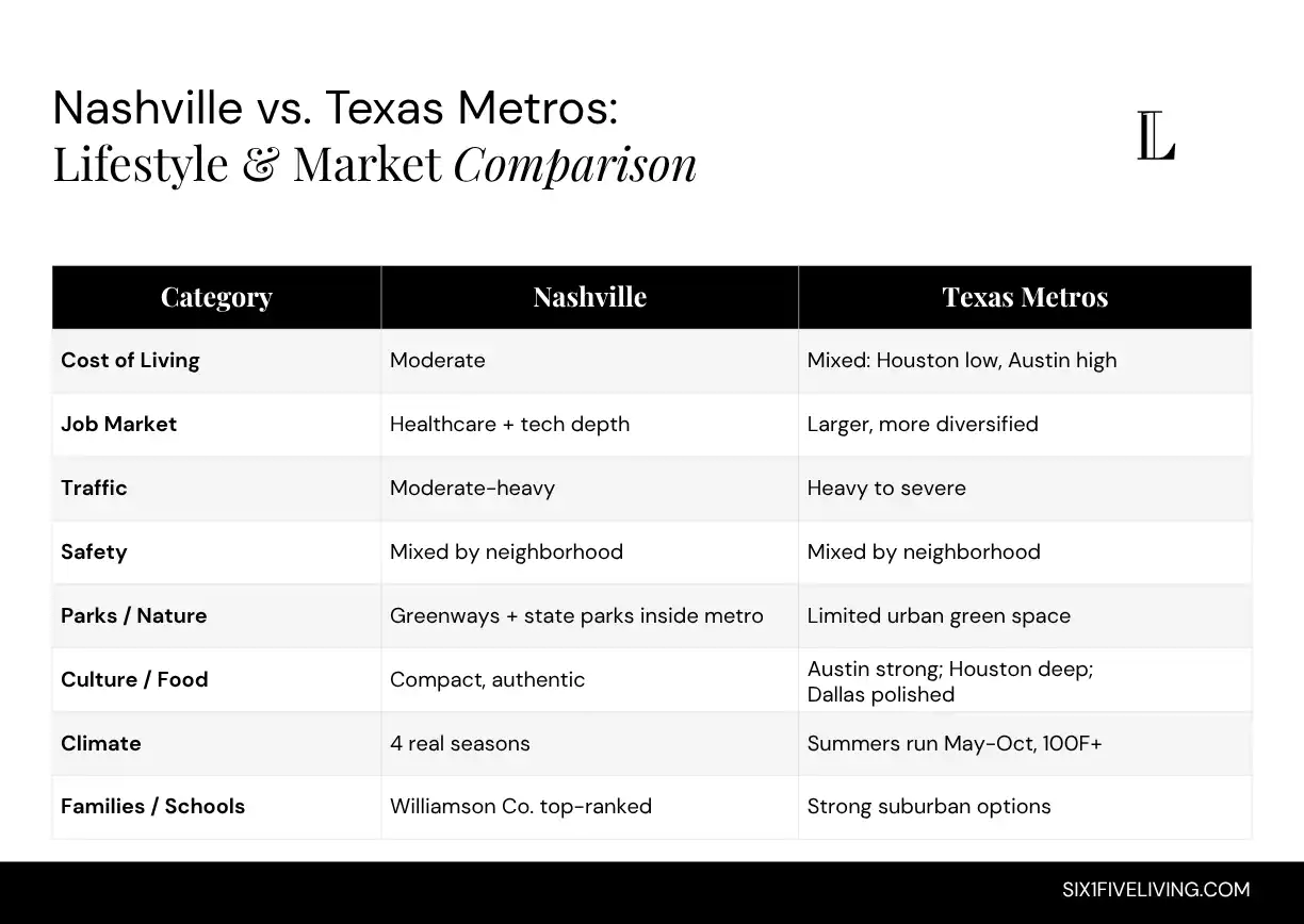 Nashville wins on traffic, climate, green space, and total housing costs compared to Austin. It wins on healthcare career density against all three. The buyers who move here from Texas and prefer it are consistently the ones who hit the ceiling on what Dallas or Austin could offer them relative to what those cities demanded in commute time, heat, and carrying costs. What the Nashville market currently looks like puts that comparison on a specific price-point footing worth seeing.